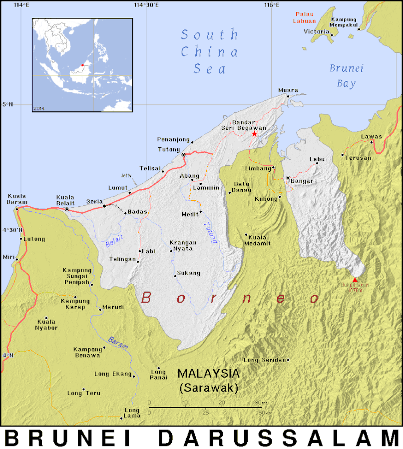 Brunei est un petit pays situé sur l’île de Bornéo, en Asie du Sud-Est. Il est bordé par la mer de Chine méridionale au nord et entouré par la Malaisie (l’État de Sarawak) sur ses autres frontières. Le territoire du Brunei est divisé en deux parties distinctes, séparées par le district malaisien de Limbang.